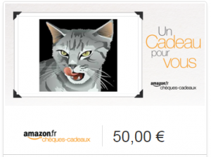 Le lot est constitué d’un bon d’achat de 50€ à valoir sur le site amazon.com . Si pour une raison quelconque, il est impossible de délivrer ce bon d’achat, le lot sera remplacé par un autre cadeau de même valeur ( 50 € ) .
